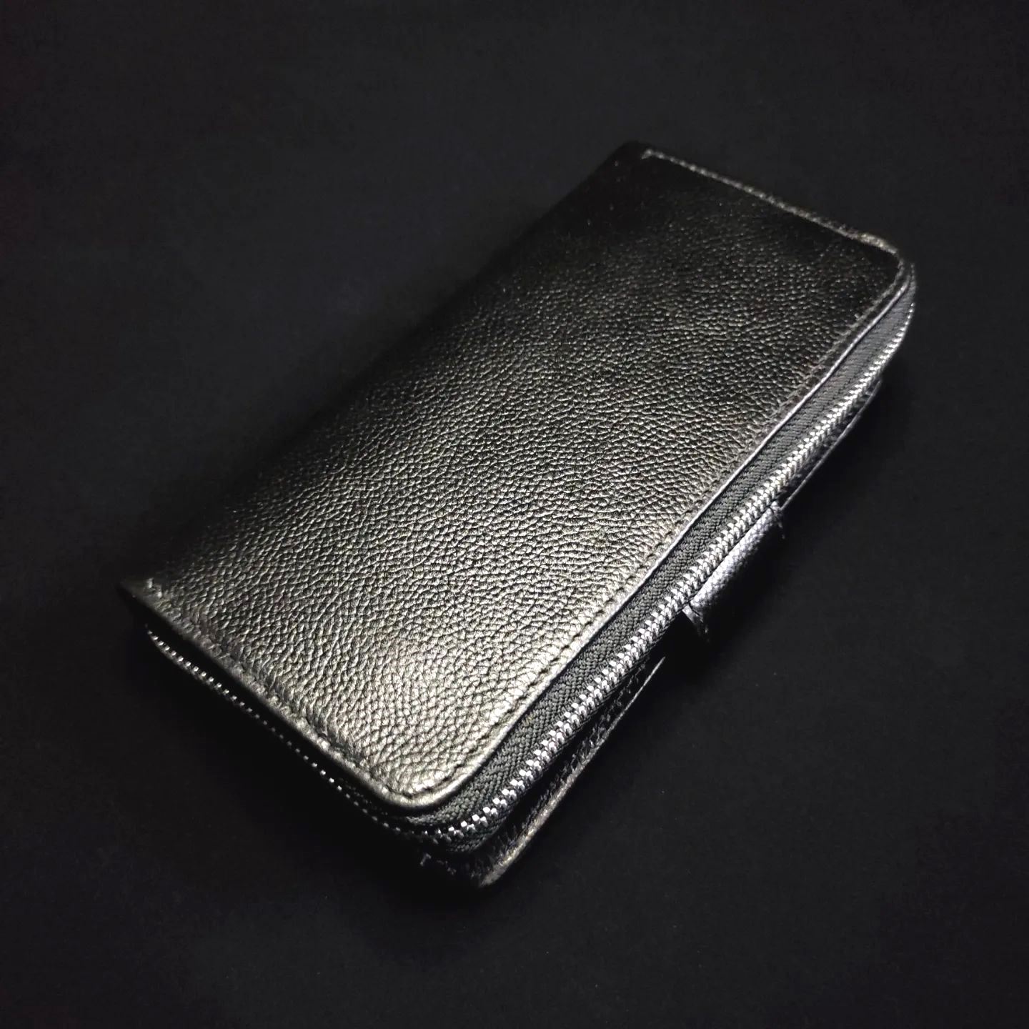 Black Lychee Embossed Leather Zip-Around Long Wallet with Phone Slot