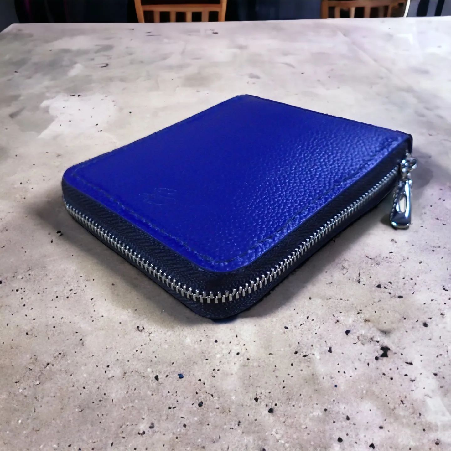 March 24, 2026Men’s Zip-Around Bifold Wallet in Blue Lychee Embossed Leather